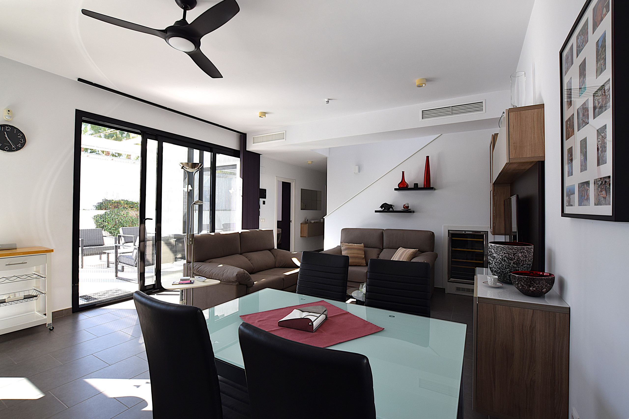 En el interior, la espaciosa sala de estar incluye un enfriador de vinos integrado, que es un detalle encantador para veladas relajadas junto a la piscina. La cocina completamente equipada hace que cocinar sea sencillo, ya sea que esté preparando un desayuno rápido o una cena tranquila. Cada dormitorio es luminoso y espacioso, con dos ubicados en la planta superior que ofrecen terrazas privadas y aire acondicionado controlado individualmente para una comodidad personalizada. El estacionamiento se puede hacer en el garaje o en el estacionamiento privado.