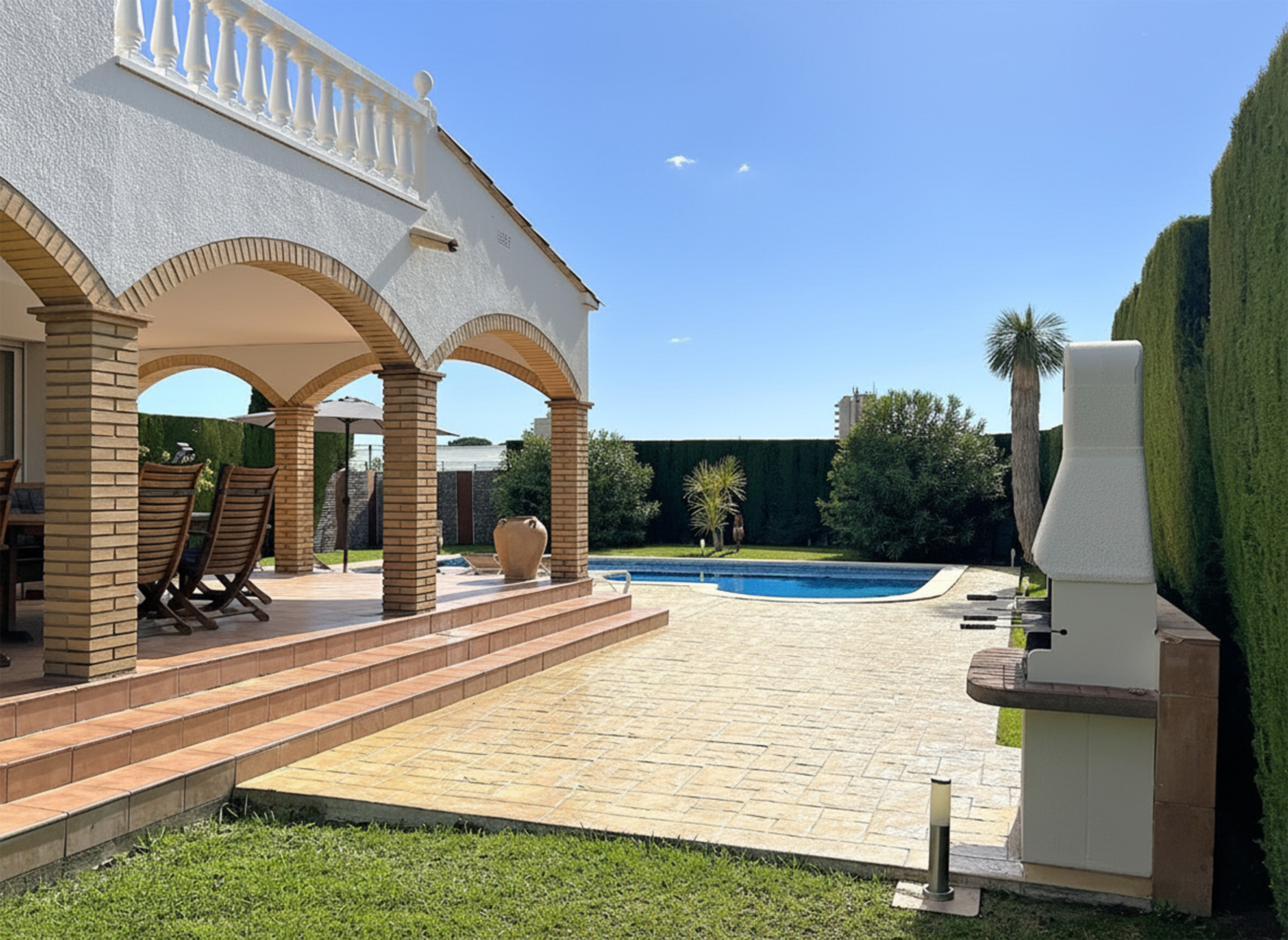 En el interior, la villa combina comodidad y funcionalidad con una acogedora sala de estar, cocina totalmente equipada y amplios dormitorios y baños, perfecta para familias o grupos. En el exterior, disfruta de tu propio oasis privado: un hermoso jardín, terraza cubierta y una piscina tentadora con tumbonas – ideal para tomar el sol español.