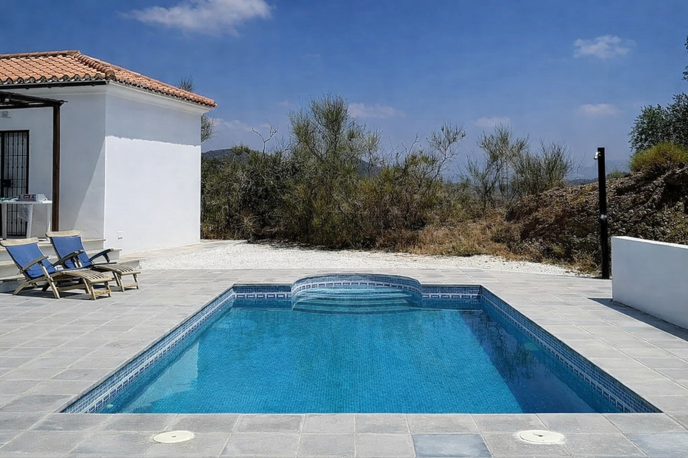 La piscine privée avec douche extérieure offre un rafraîchissement bienvenu lors des journées chaudes, tandis que la pergola procure une ombre agréable pour se détendre et admirer de beaux couchers de soleil. La maison est entièrement équipée de conforts modernes, comprenant la climatisation, un parking privé, du mobilier de jardin et des transats.